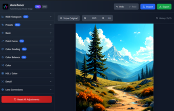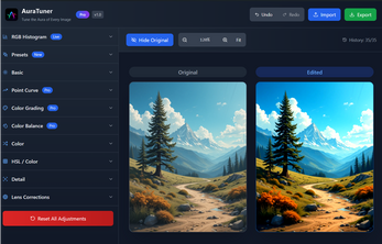 Aura Tuner is an advanced image color correction tool designed for photographers, designers, and creators who want full control over image tones and colors. With real-time RGB histograms, intuitive color wheels, and precise balance tools, Aura Tuner empowers you to perfect every pixel.